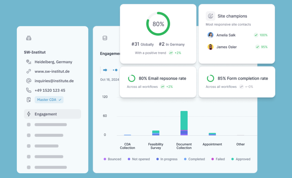 Negotiate CDAs, run feasibility, and site decisions in one workflow — with every interaction (email, clause, response) captured into reusable site and contact records, so teams stop re-asking and start moving faster.